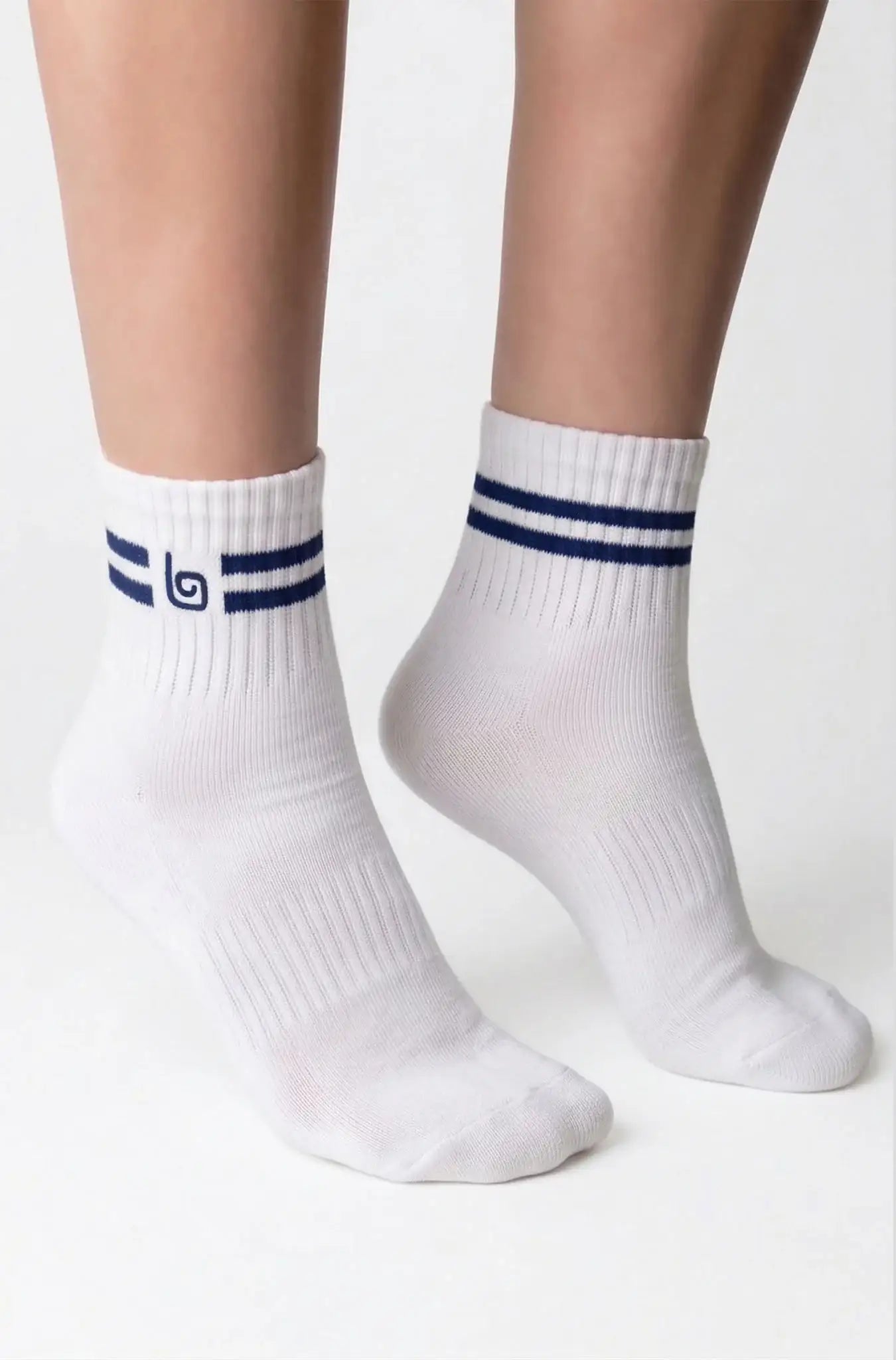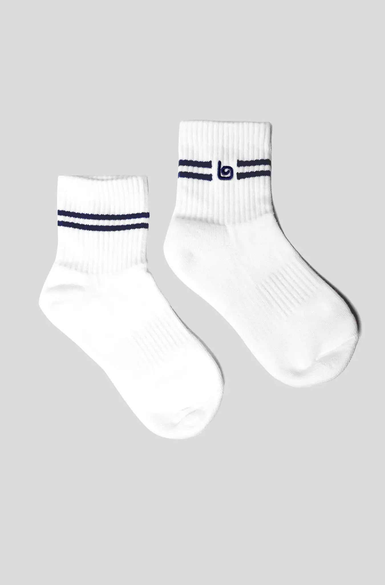The Striped Quarter Socks feature a classic quarter-length ribbed silhouette with clean contrast stripes and an embroidered logo detail at the center for a subtle signature finish.