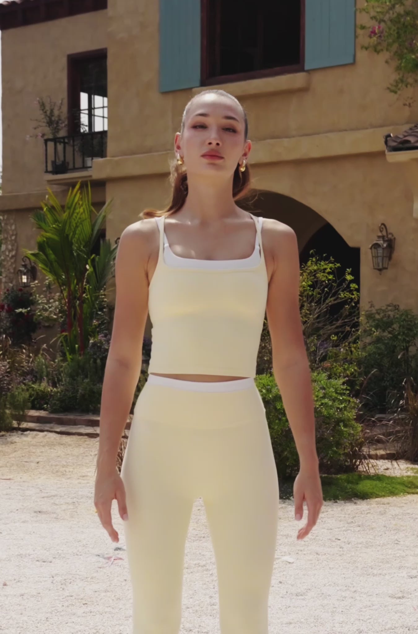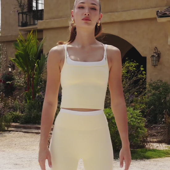 Soft and radiant in butter yellow, this double layer cross tank brings gentle structure to a clean, modern silhouette. Designed to feel smooth and supportive, it moves effortlessly from studio sessions to everyday styling.